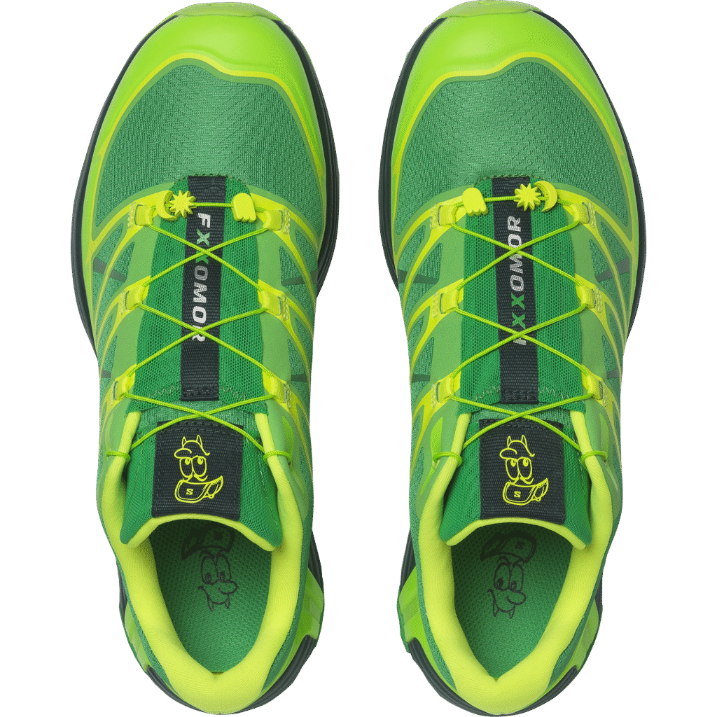 Cada detalle del calzado lleva el ADN de Feid. El modelo incorpora charms personalizados en el sistema Quicklacedetalles fosforescentes, y una caricatura dibujada a mano por el propio artista. Se suman el tejido con la etiqueta “FXXOMOR”, alusiones a su alter ego, y gráficos co-firmados en la lengüeta y la plantilla. Todo esto se equilibra con la ingeniería técnica de Salomon —como el sistema Advanced Chassis y la tracción todo terreno— para crear un punto de encuentro entre el rendimiento outdoor y la expresión cultural.